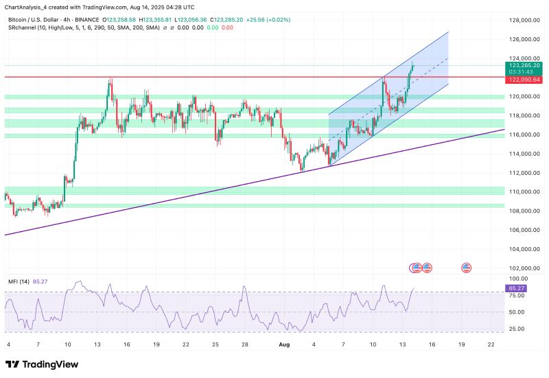 4小时图显示,BTC价格在上行通道中交易,同时跟随趋势线支撑位和阻力位。中线一直是短期动态枢轴,价格目前正接近通道上边界,约为124,200美元。资金流量指数(MFI)为85.27,这意味着市场超买。这意味着动能强劲,但可能需要尽快降温。