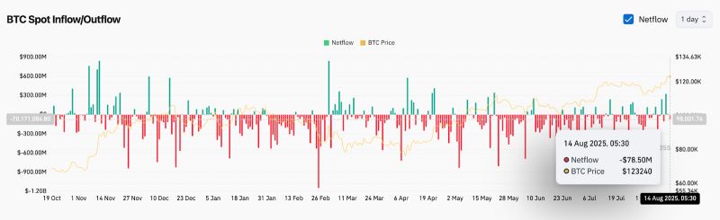 比特币价格目前交易价格约为123,280美元,较昨日上涨0.44%。它突破了122,000美元至122,500美元的阻力位。此次突破是在巨大的买盘压力和交易所的强劲资金流出之后发生的,现货净流量数据显示,8月14日有7850万美元的资金流出。这表明,随着BTC测试其上升通道的上限,其吸筹活动有所加强。