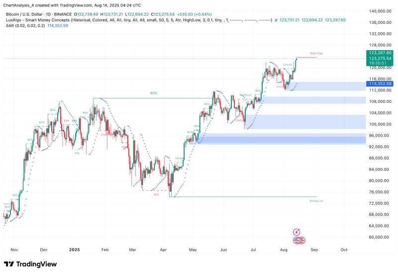 自7月下旬以来,BTC日线图上持续强劲上涨,突破了特征变化(CHoCH)水平,重回看涨结构。目前价格正在测试123,287美元附近的弱势高点,抛物线转向指标(SAR)点远低于价格,位于114,352美元,这表明市场看涨。主要需求区域位于112,000美元至116,000美元之间,近期吸筹阶段的大量订单区块都位于此处。