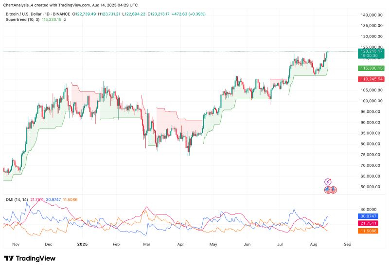 日线图上的超级趋势指标依然看涨,趋势支撑位在 115,330 美元,远低于当前市场价格,为多头提供了广阔的缓冲区。日线图上的 DMI 指标显示 +DI 为 30.97,稳固高于 -DI 为 21.75,ADX 为 11.50,并开始上升,这表明如果价格维持在当前水平之上,趋势强度可能会增强。