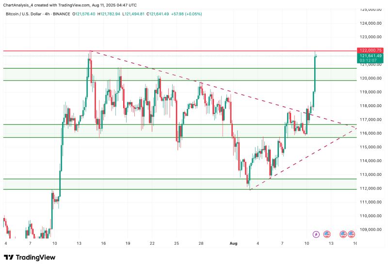 比特币价格今日接近 121,964 美元,此前已突破本月早些时候限制上涨势头的 118,803 美元关口。这一走势突破了 4 小时图上持续数周的对称三角形态,并推动价格测试 122,000 美元区域。