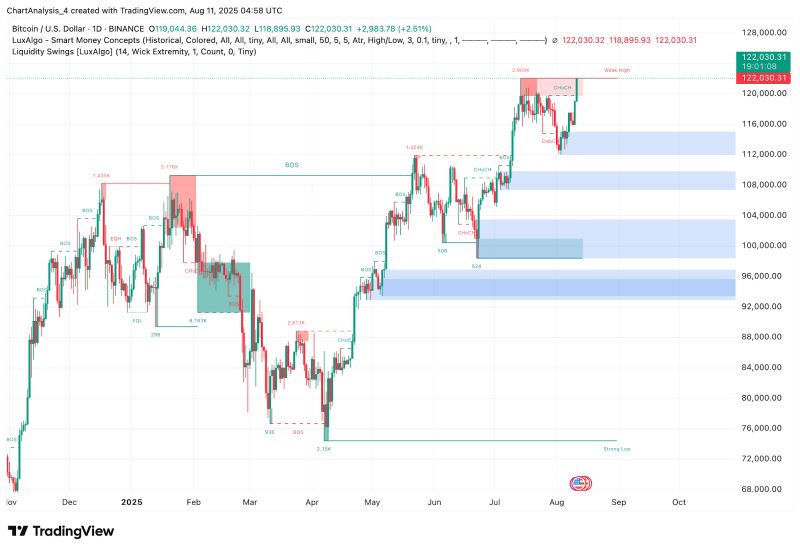 这一水平与Smart Money Concepts日线图上此前的波动高点相同,被标记为“弱势高点”,表明流动性尚未到位。如果买家能够确保日线收盘价稳固高于该水平,则仍有上涨空间,有望冲向124,193美元。