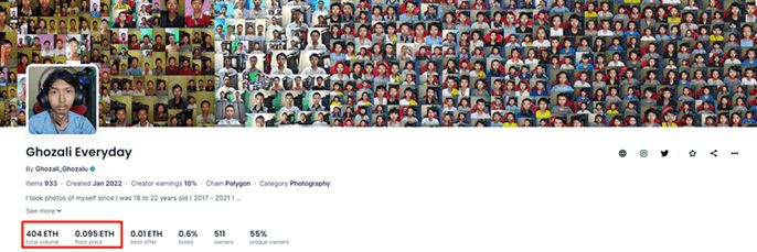 许多知名的NFT比如Bored Ape Yacht Club、Azuki,都是团队创建并出售,获得不菲的收入。然而,个人也可以创建NFT,并在NFT平台出售。其中,有一个印尼的男子把自己17-21岁期间的自拍照制作成NFT出售,交易量达到400ETH,地板价(最低价0.095ETH)。