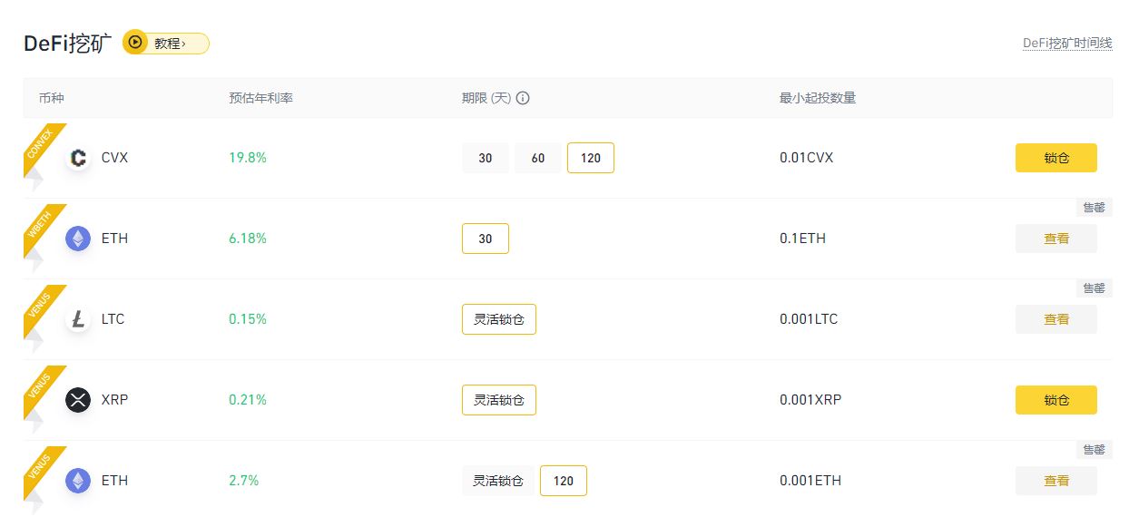 一般来说,存币数量越多,时间越长,利息会越多。下面是Binance交易所的存币生息产品: