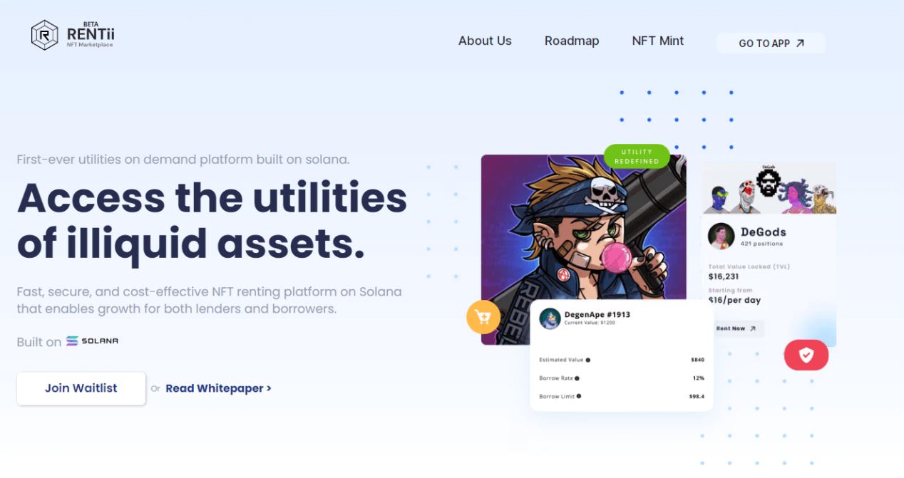 在文章的第一部分我们提到了创建NFT出售以牟利的方法。但其实除了出售以外,投资者亦可以创建或者购买优质的NFT资产,然后进行出租以赚取固定收益。这就好比租房、租车一样,本质上是NFT的拥有着让渡资产的使用权以获取租金的行为。近些年随着NFT数量的爆炸式增长,NFT租赁平台的数量也呈现了井喷的态势。比如RENTii平台就是一个建立在Solana公链上的NFT租赁平台,允许用户自行上架出租自己的NFT。