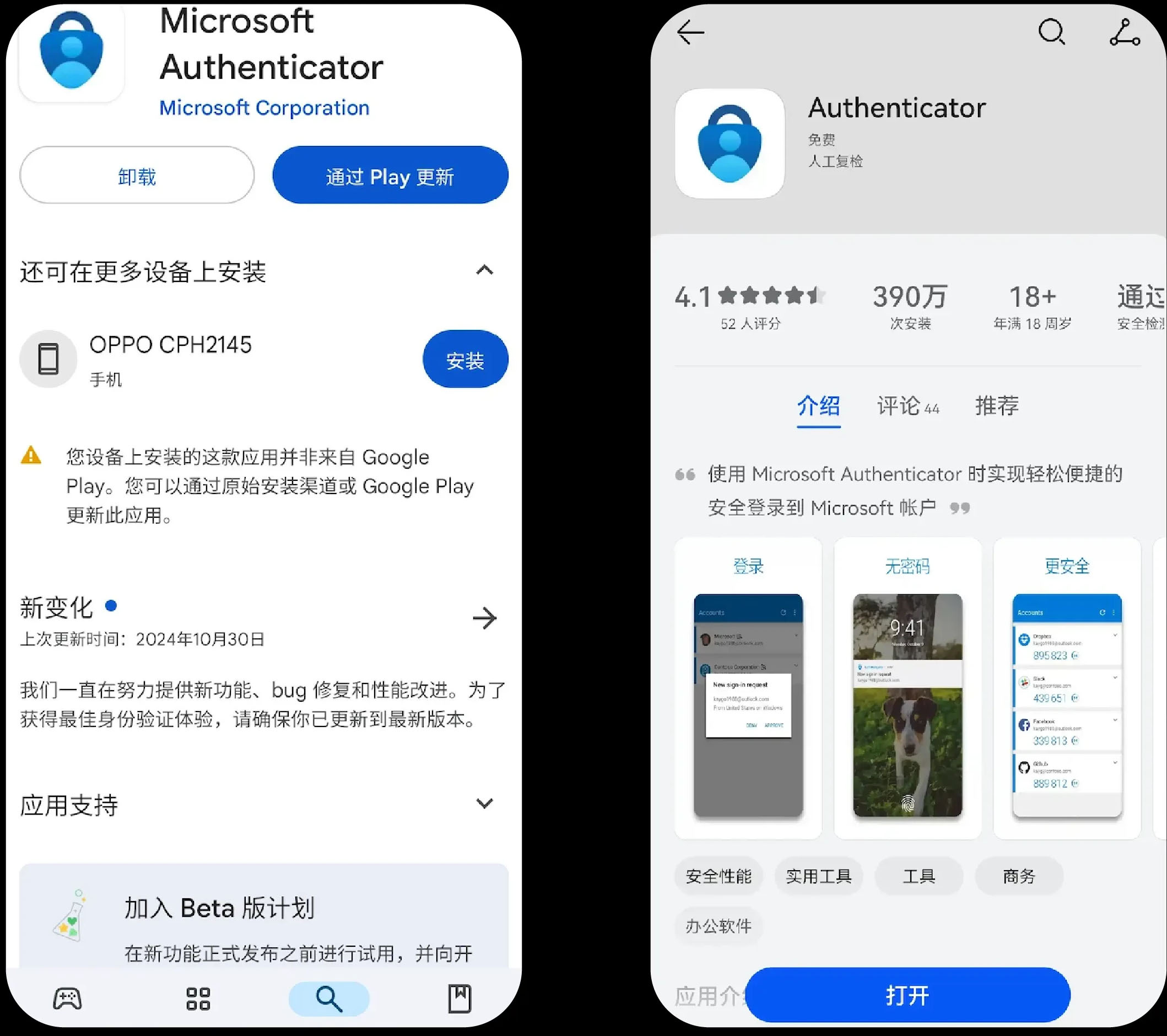 安卓手机需在 Google Play 下载(需要手机设备能够访问 Google 服务),也可以在华为应用市场、小米应用商店、OPPO 应用商店、VIVO 应用商店等主流应用商店里下载,如果您的手机上的应用商城没有 Microsoft Authenticator,可以先下载上述主流应用商店中的任意一个,再进行下载。