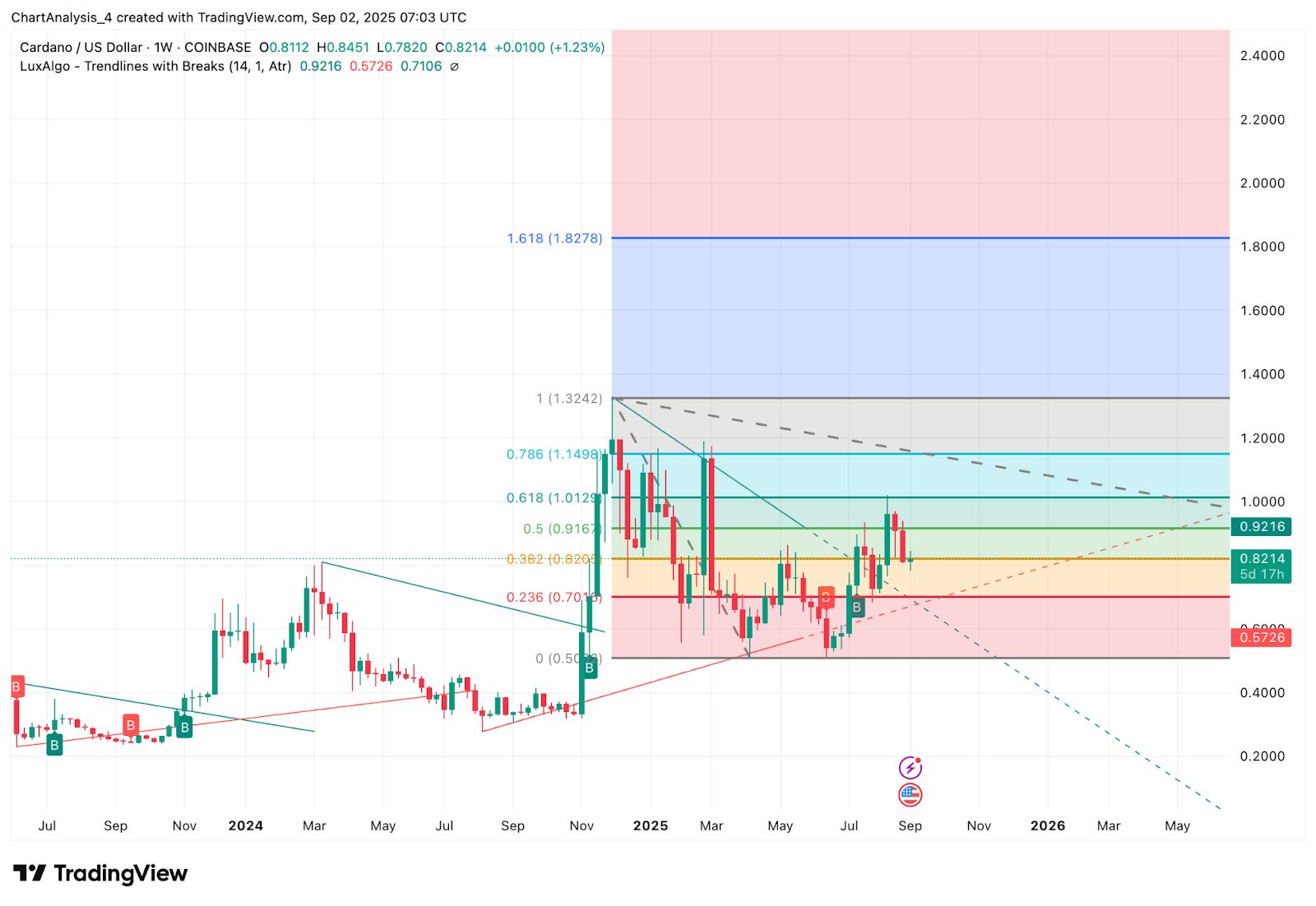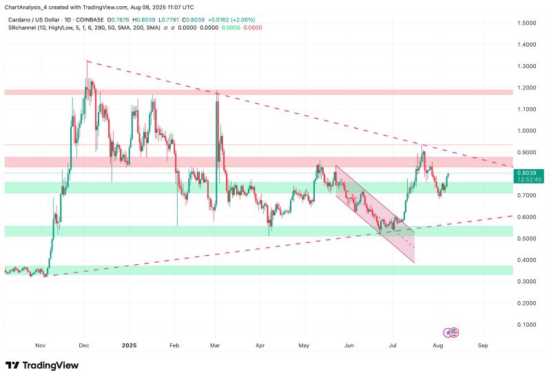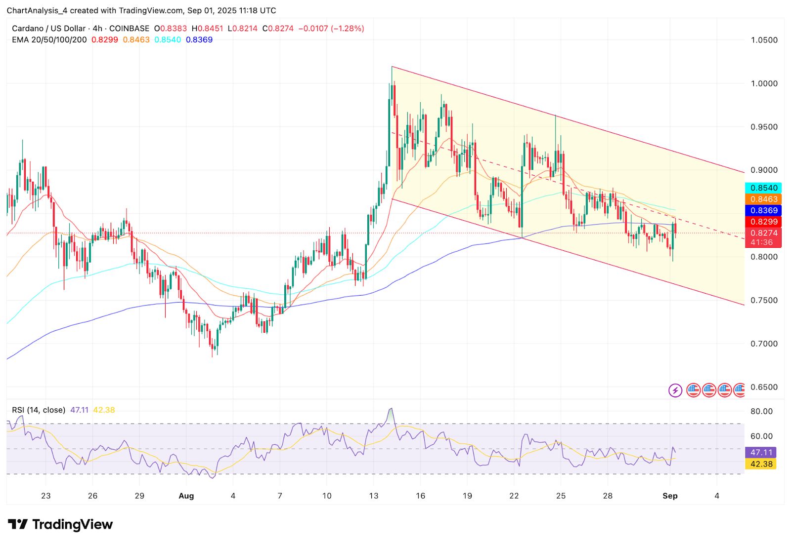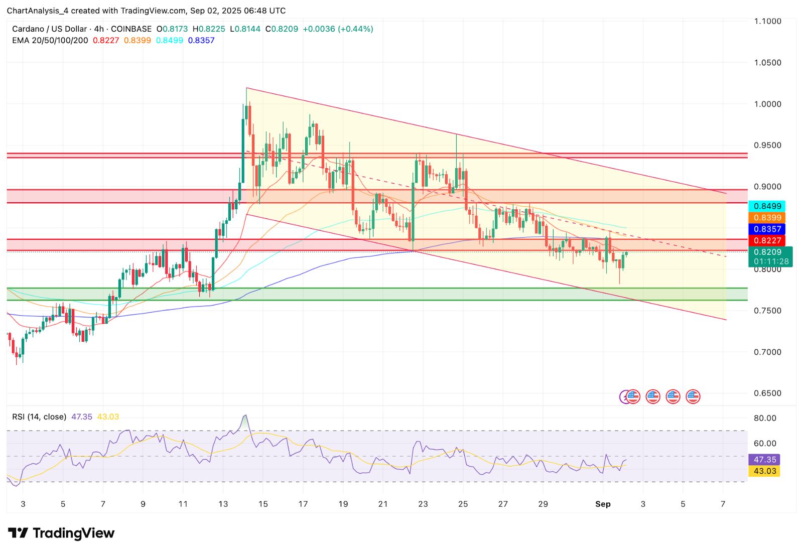 日线图显示,ADA 处于收窄的盘整结构内,价格位于两条汇聚趋势线之间。下方趋势线支撑位位于 0.80 美元附近,阻力位位于 0.87 美元,与之前的突破位以及前期上升通道的中线一致。