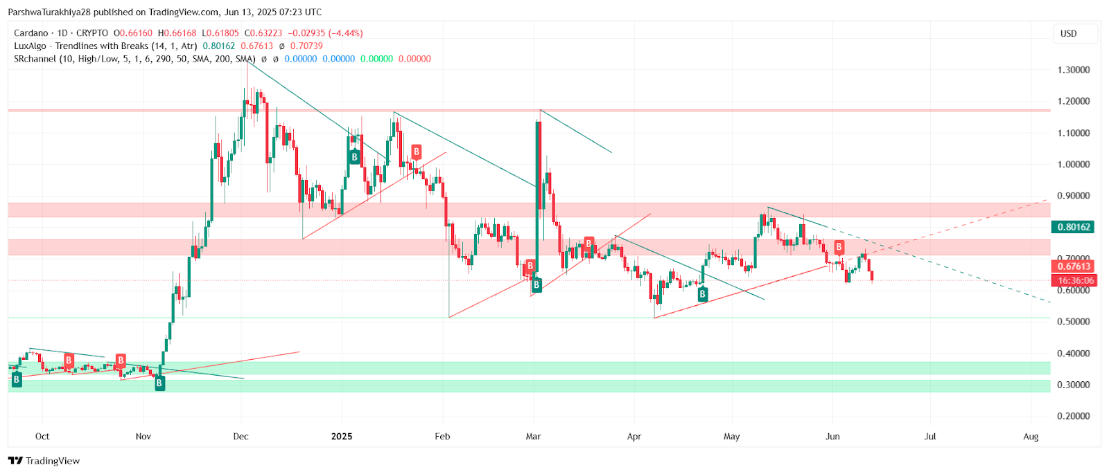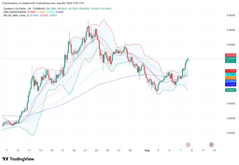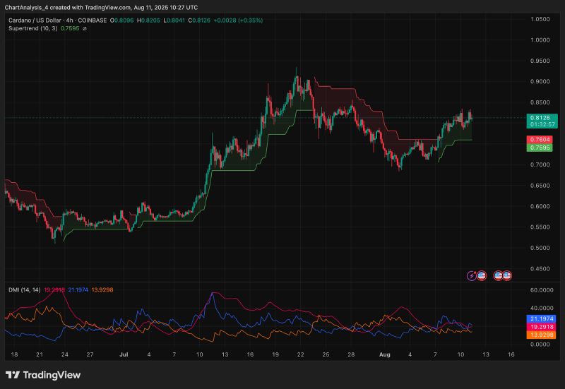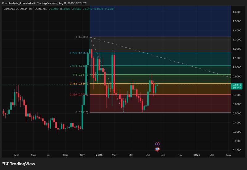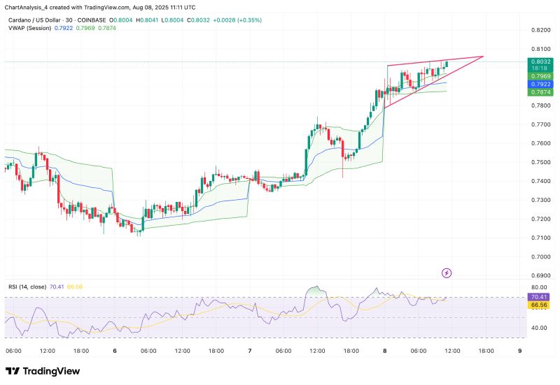 日线图显示,ADA 处于收窄的盘整结构内,价格位于两条汇聚趋势线之间。下方趋势线支撑位位于 0.80 美元附近,阻力位位于 0.87 美元,与之前的突破位以及前期上升通道的中线一致。
