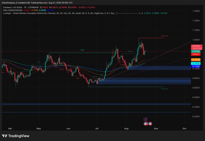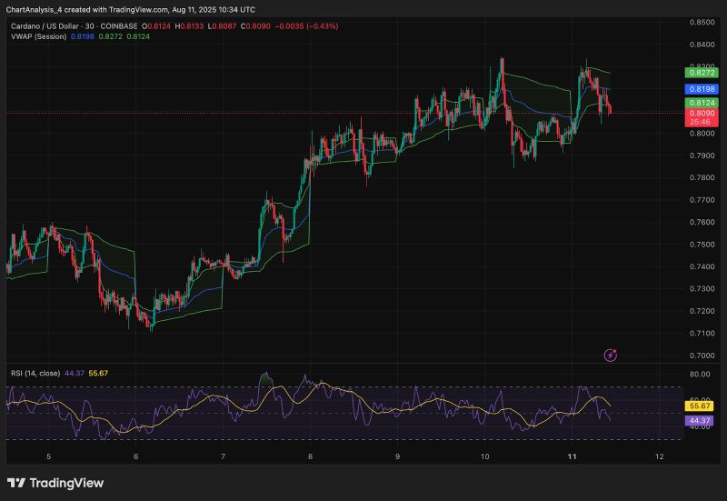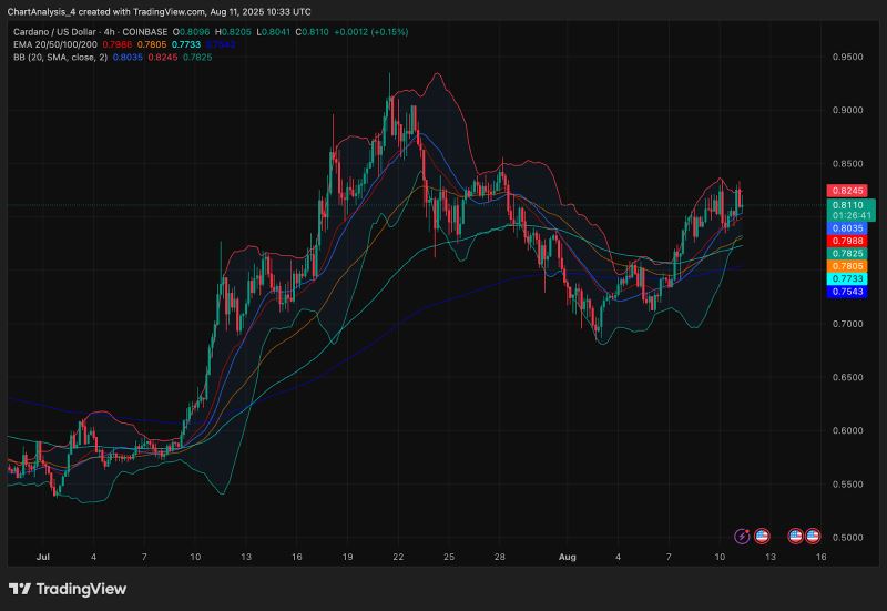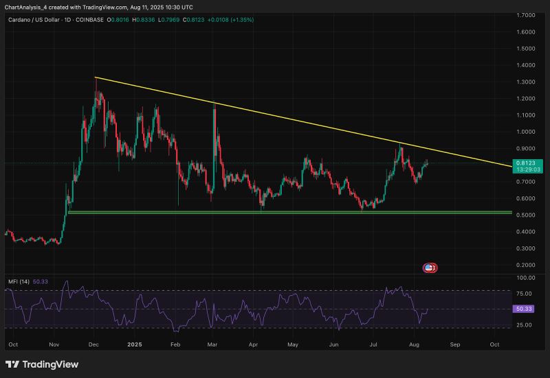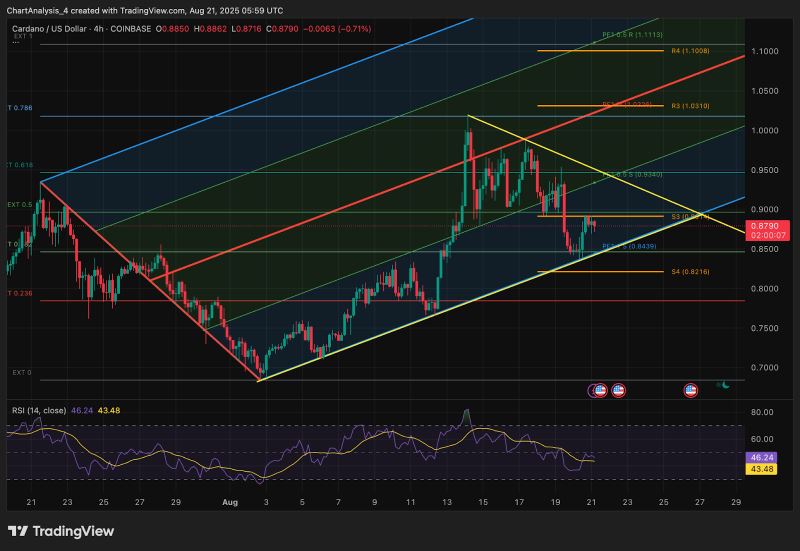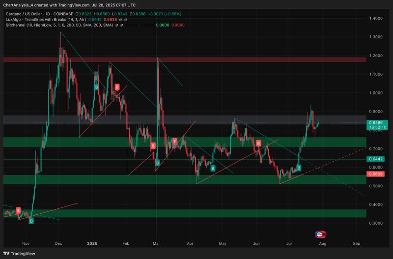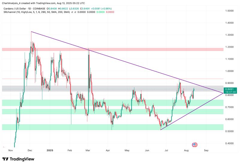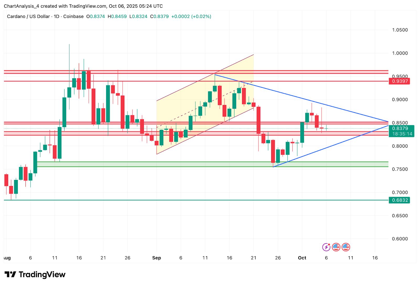 卡尔达诺 (CRYPTO: ADA) 今日交易价格在 0.837 美元附近,在日线图上呈收紧对称三角形态,并保持稳定。买家正试图捍卫 0.82-0.80 美元的支撑位,而阻力位仍然位于 0.85-0.87 美元附近,这是短期形态的上边界。