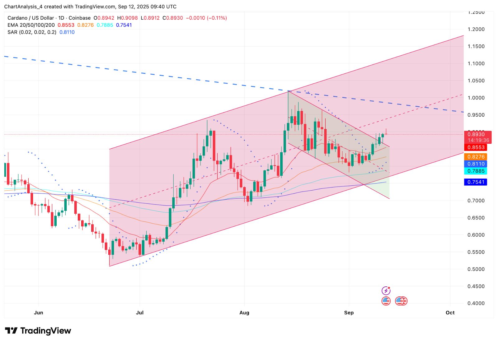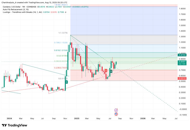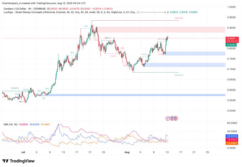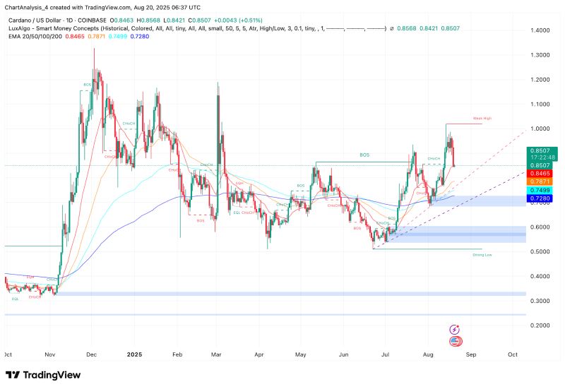 分析师仍持谨慎乐观态度。只要ADA维持在0.85美元上方,短期内就倾向于再次测试0.90-0.93美元。突破0.93美元将证实牛市周期的早期观点,而跌破0.82美元则可能推迟反弹,并迫使其重新进入盘整阶段。