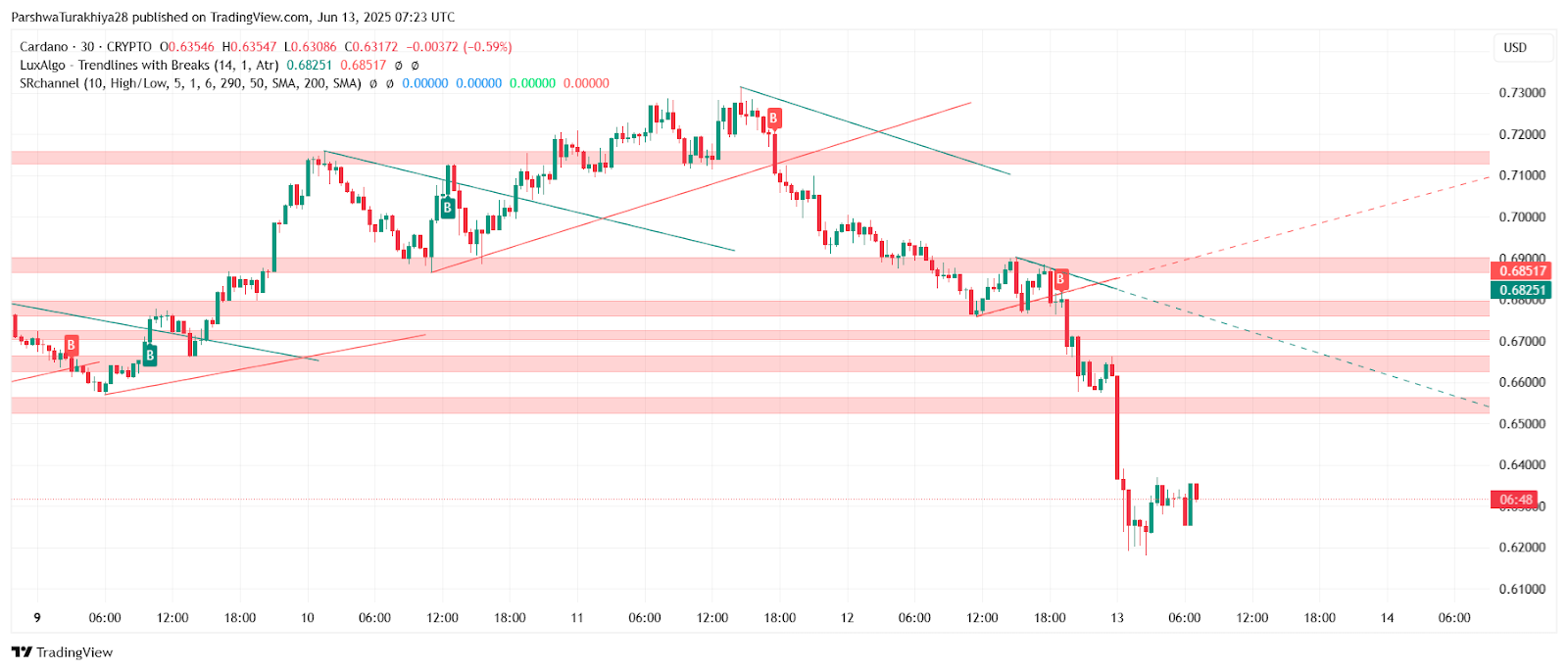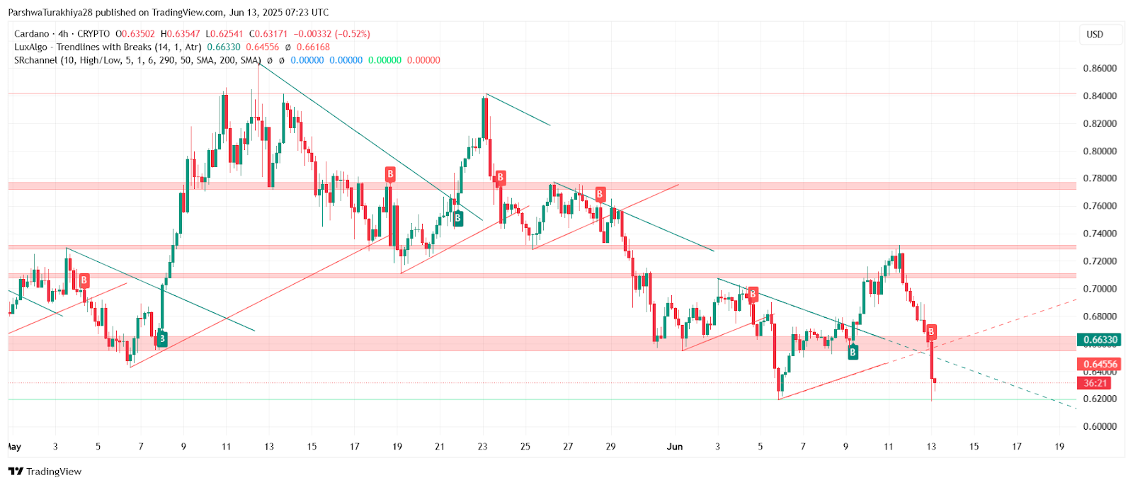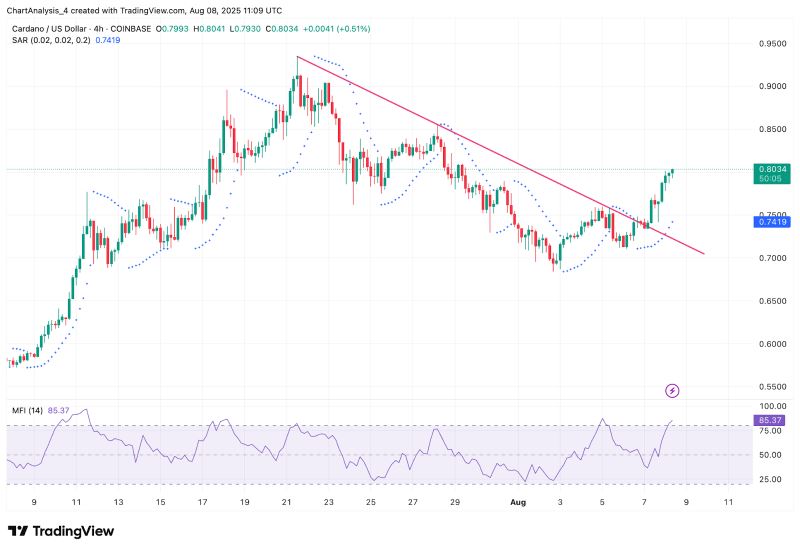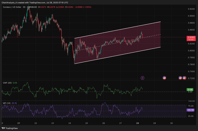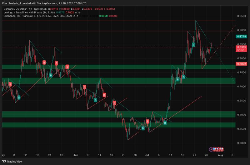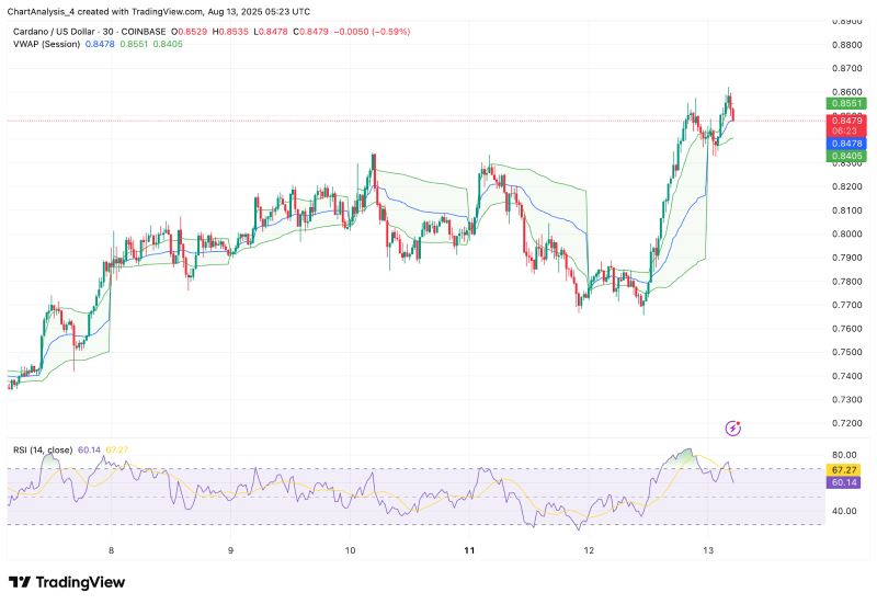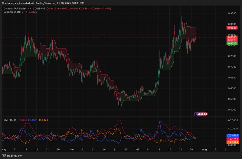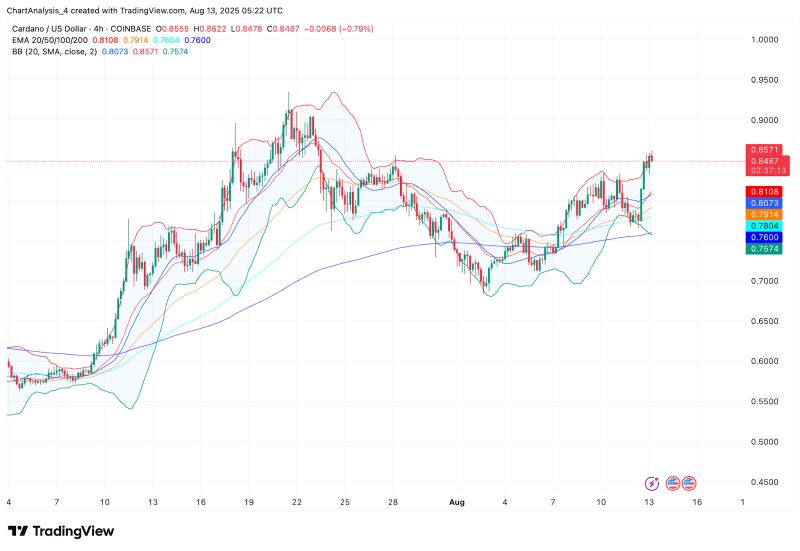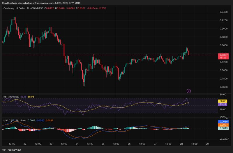 - 卡尔达诺的交易价格在 0.82 美元至 0.87 美元之间,在关键阻力位附近势头有所减弱。