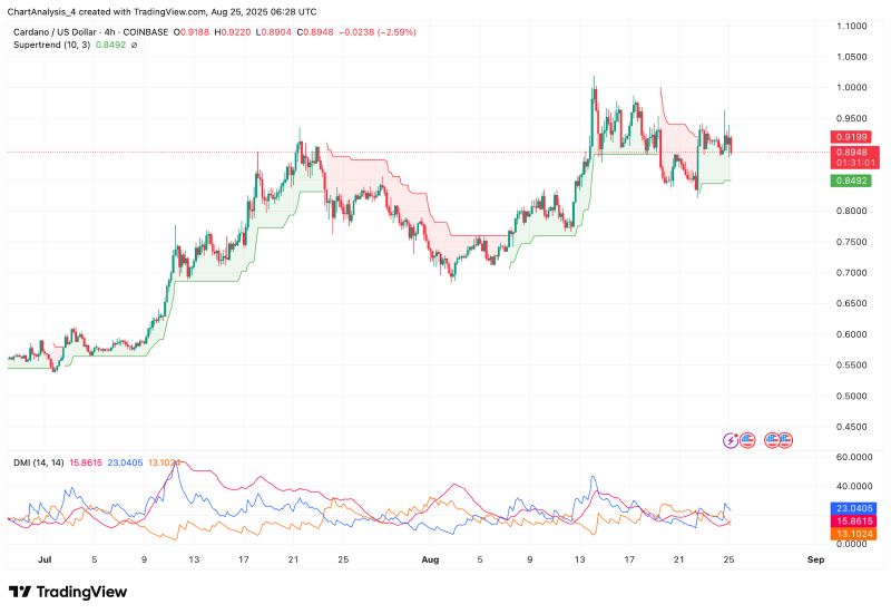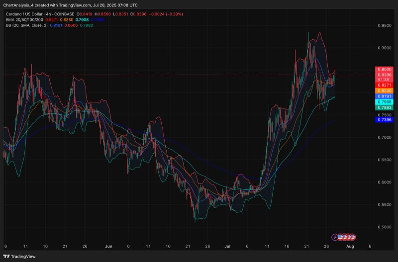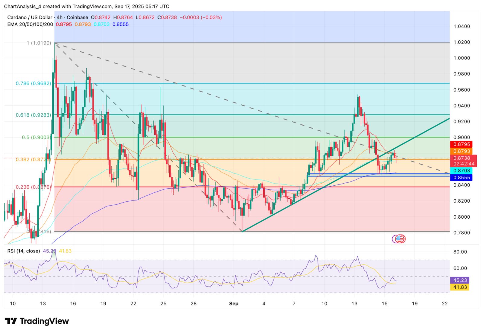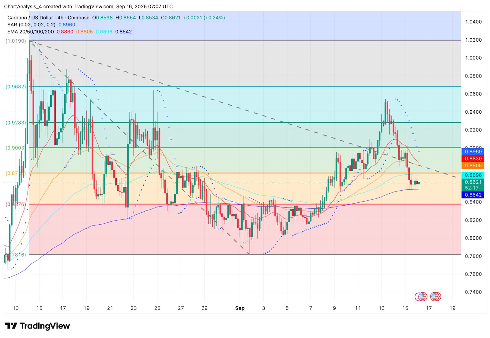 4小时图显示,ADA在200日均线0.85美元上方盘整,该水平与近期反弹的0.382斐波那契回撤位相吻合。20日和50日均线在0.88美元附近对齐,立即造成上方压力。