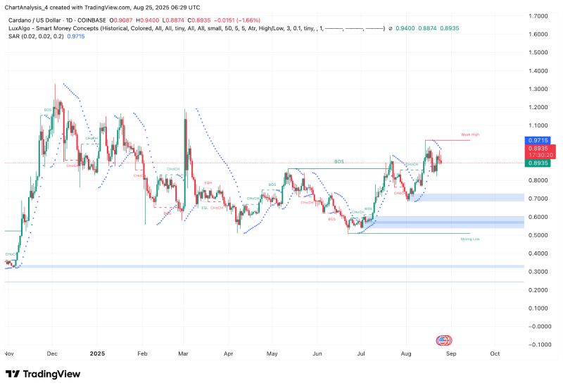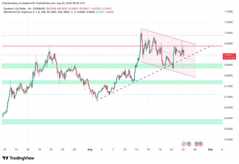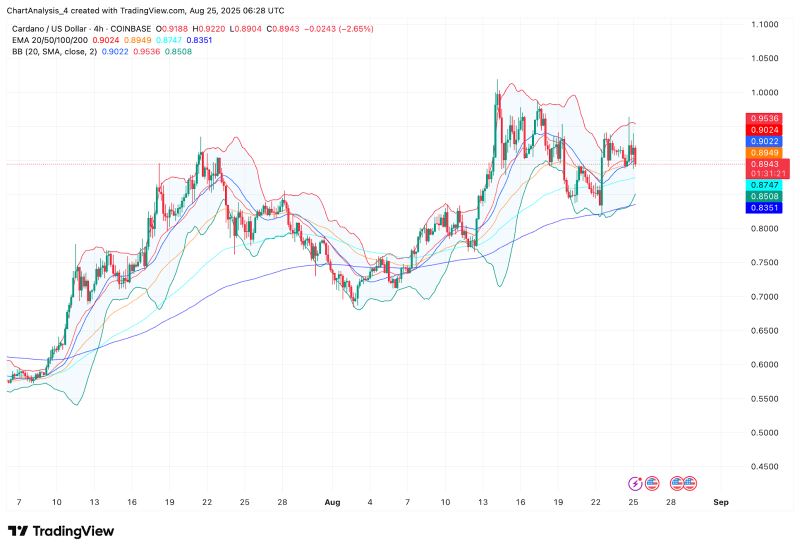 - 卡尔达诺交易价格接近 0.893 美元,维持在 0.85 美元上方支撑位,同时测试 0.90-0.95 美元的阻力位。