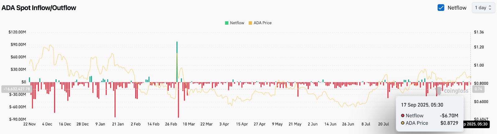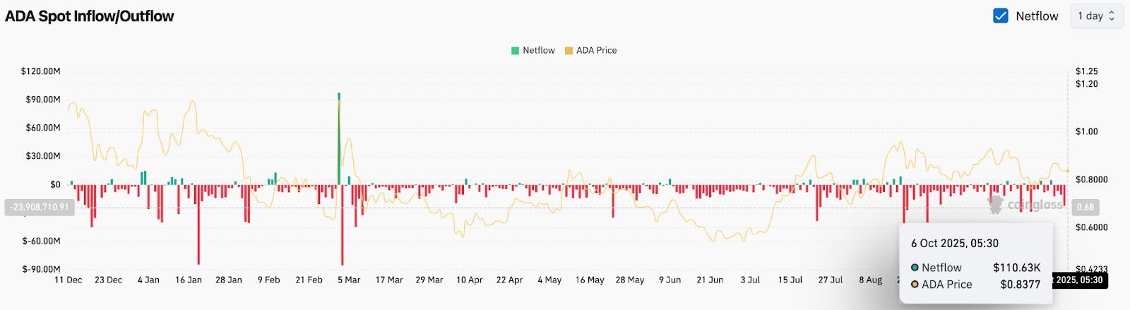 根据 Coinglass 的数据,Cardano 的净流入量在前一天急剧下降 2200 万美元后,于 10 月 6 日转为正值 11 万美元。这一转变表明,在大量资金流出后,抛售压力有所减轻,尽管交易量仍远低于 7 月和 8 月的水平。