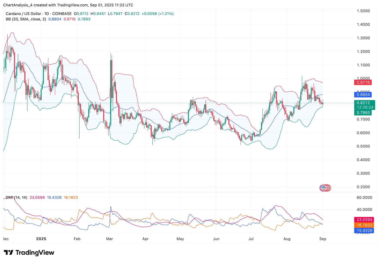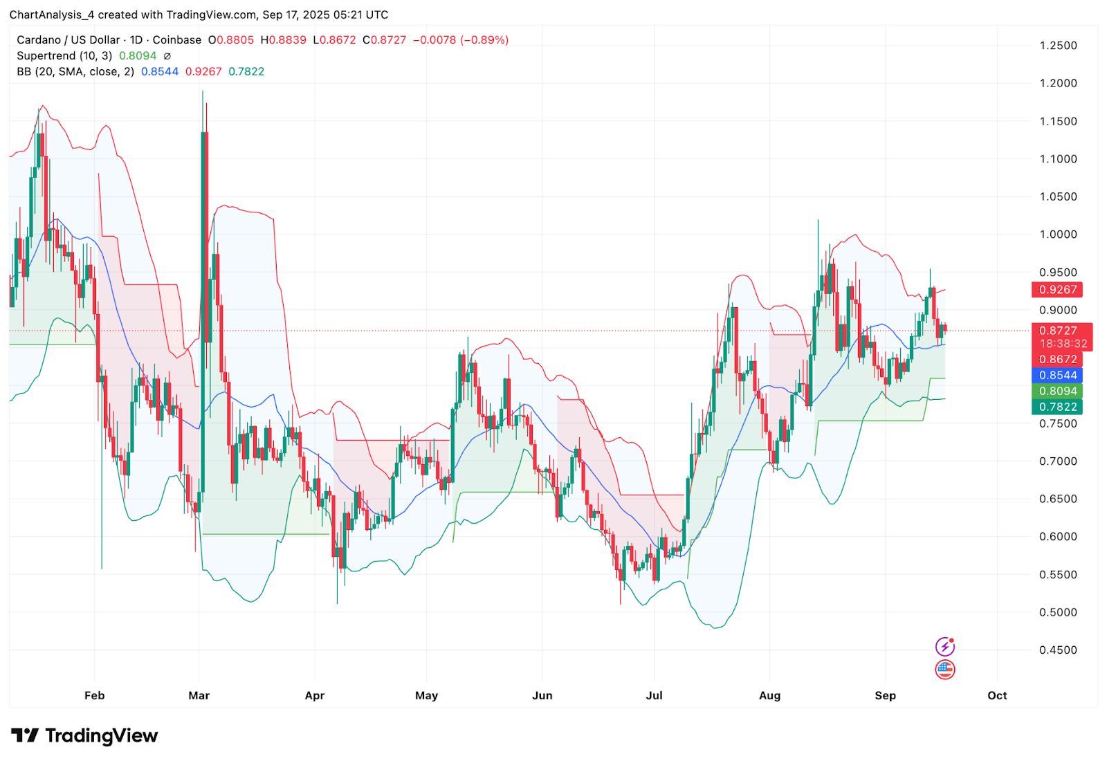 日线图上,ADA 在布林线中线附近 0.87 美元附近交易。上轨位于 0.92 美元,与关键阻力位一致,下轨位于 0.78 美元,提供更广泛的下行缓冲。