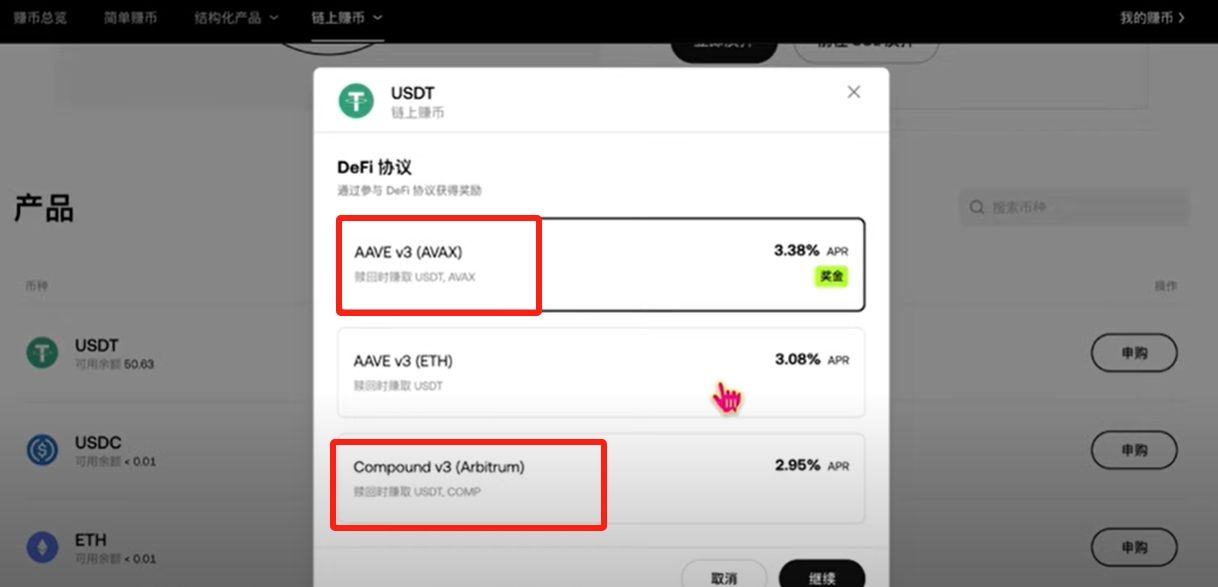 它具体有哪些产品呢?这里最稳健的肯定是USDT跟USDC,因为只有这俩是稳定币,价格基本上不会有波动。主流币有比特币跟以太坊,但是利率就非常低了。