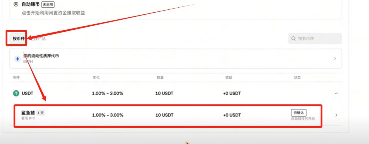 往下捯,在“按币种”里面你能够找到USDT底下这些购买的产品,这里面就会有你买的各种鲨鱼鳍。比如说这里面有一个即将到期的一天的封闭期的。