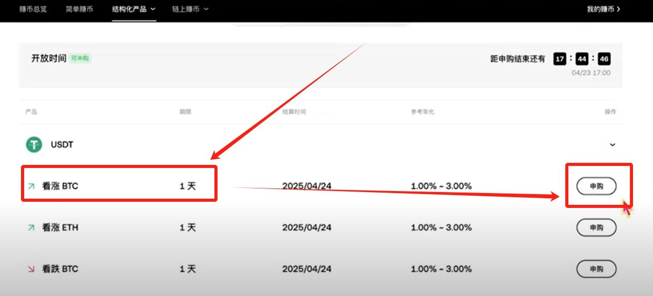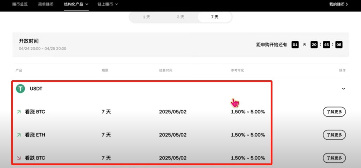 一天你就只能够去买USDT这个产品,其实我们一般也就是买这个产品。而且一天这个封闭期是刚推出没有多久,这个其实是非常好的,因为它本身锁定的时间就短,你的灵活度就会更加高。对应的标的是比特币跟以太坊看涨或者是看跌,你就根据自己的判断来选择,反正你选对选错最终都是保本的。如果你选择总体来说是对的,那你整体的收益会更高一些。它参考的年化目前看并不高,1%-3%。但是利率他是会随时调整的,如果行情比较好的话,他也会变得比较高。