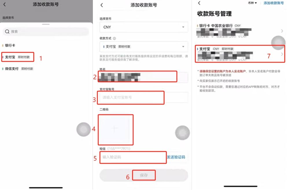 支付宝和微信是如何添加的呢?我们来演示一下。点击【支付宝】,输入你的支付宝账号,再把你的支付宝二维码添加进去,发送验证码,点击【保存】,这时我们的支付宝就添加成功了。微信也是同理,也是一样的方法。