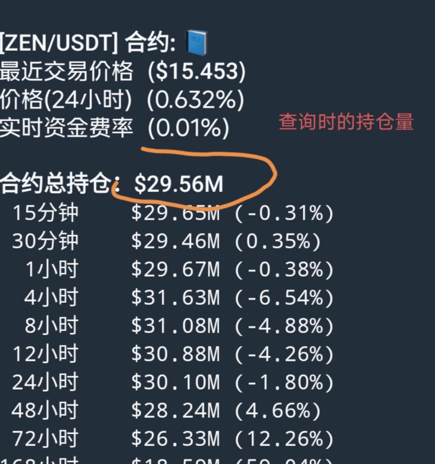 2、持仓量变化,最近多少时间以来的持仓变化。上图中有多个时间级别,从15分钟到168小时(也就是一周)的持仓量。当前是29.56M,15分钟前29.65M,12小时前是30.88M,一天前(24小时前)30.1M以此类推。后面的百分比表示现在的持仓比起那会持仓变化了多少,如当前比12小时前少了4.26%。