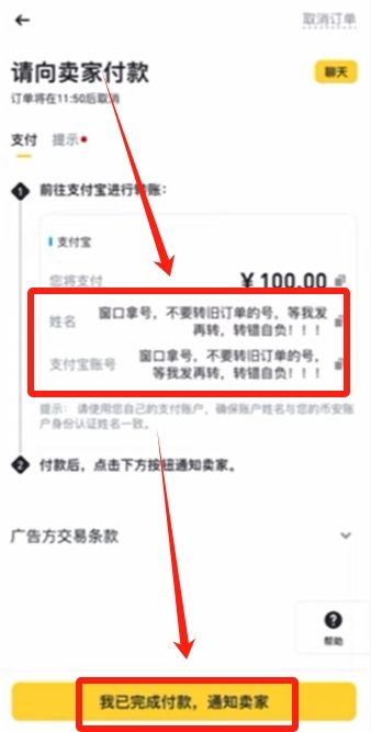 这时候商家的姓名、银行账号、名称和开户银行都已经显示出来了。他这里说窗口拿号,不要转就订单的号。窗口就是刚才的聊天框我们返回到聊天框,打开支付宝,直接进行付款。如果是银行卡就打开手机银行APP,输入他的银行账号和开户支行进行转账。有的商家可能会有一些查流水的要求,这对于我们买卖双方来说都是一个比较安全的流程,都是为了双方的安全有个保障。转账完成之后,点击【我已完成付款,通知卖家】。然后等待卖家给我们放币就可以了。