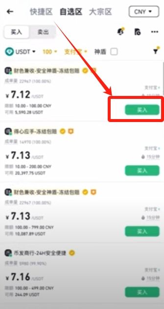 接下来我们就可以去买币了,我们仍然在【一键买币】的页面,可以看到这里有快捷区、自选区、严选区以及大宗区。