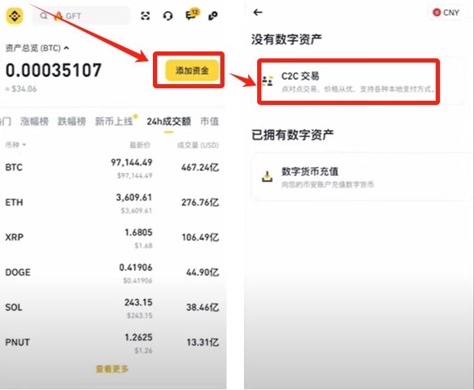 我们回到币安的首页,给大家介绍怎么样买币才安全。点击右上角的【添加资金】,选择【C2C交易】。