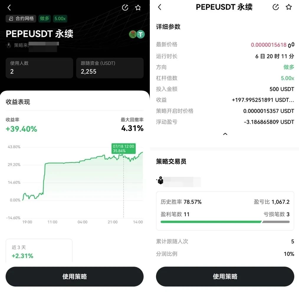 在带单员的个人主页,您可以查看历史策略的带单数据,也能够看到其目前的交易策略,点击卡片,就能看到策略的详情,包括策略模式、交易币对等信息,此外也能看到带单员设置的分润比例等信息。