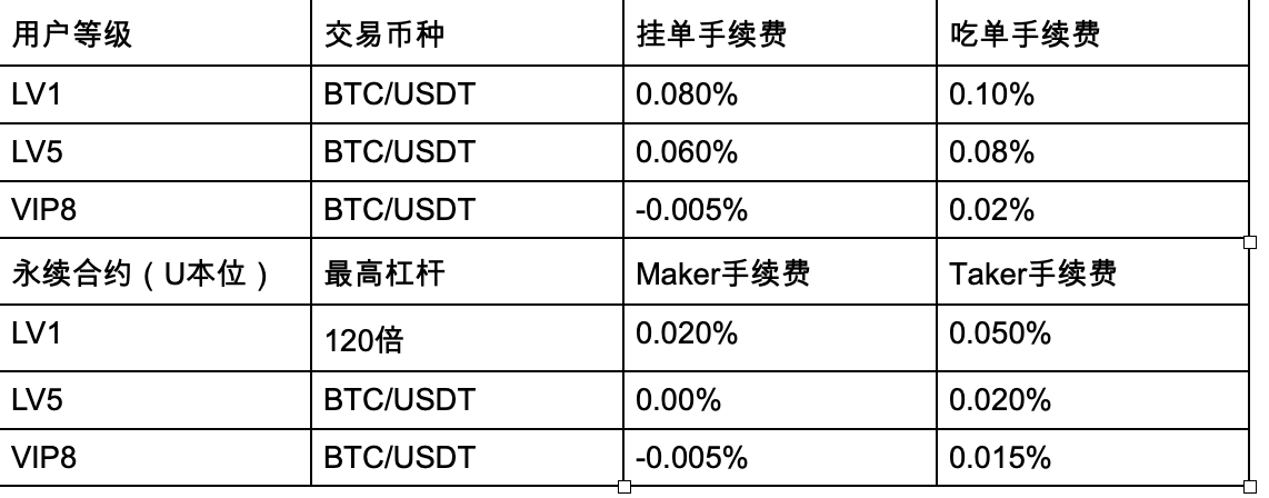 合约交易(U本位):最大0.02%的挂单交易手续费;最大0.05%的食单交易手续费;