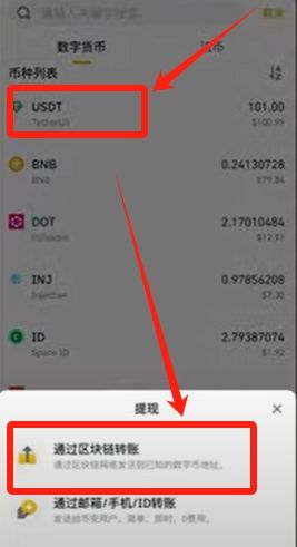 选择要提现的币种是USDT。这时候会弹出来两种提现方式,我们选择【通过区块链转账】。