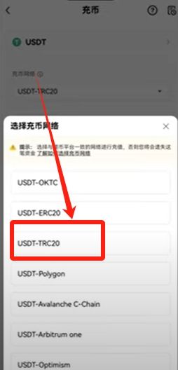 点开充币网络,这个熟悉的页面又出现了,接下来要做的就是连连看,看哪个网络发送方和接收方都有。其实充币操作多了根本不需要一个一个对比,扫一眼就知道哪一个最合适。结合手续费和到账时间,我这次选“TRC20”波场链进行充提币。