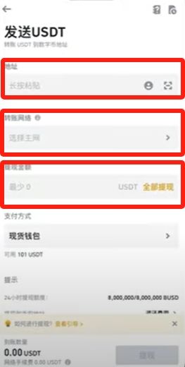 接下来的页面展示了充提币操作的三个要素,分别是地址、转账网络和提现金额。