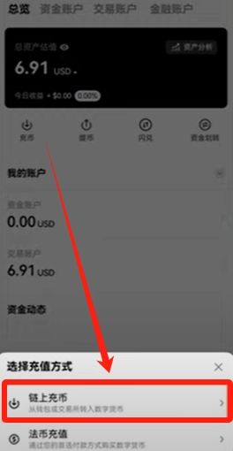 充值方式选择【链上充币】。从钱包或交易所转入数字货币。