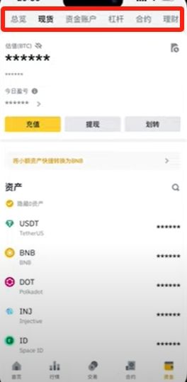 来到资金总览页面,顶部显示了5个账户。我们今天要关注的是现货账户和资金账户。如果你是法币购买USDT,币就在资金账户里。如果想用USDT购买其他币种,需要把USDT划转到现货账户里。我们今天充提币只会涉及到现货和资金这两个账户。