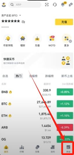 在binance交易所的APP页面,点击右下角的【资产】,点击【充币】。币安那边是提币,binance这边就是充币。提出去,充进来,互补操作。