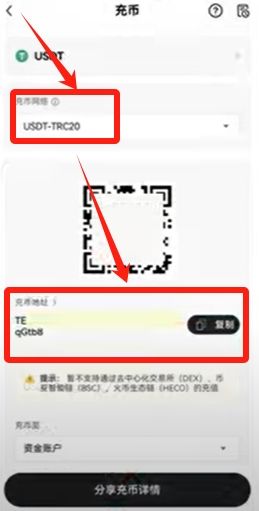 在binance这里选择TRC20之后,下面会出现一个充币地址。点击复制把充币地址复制下来。