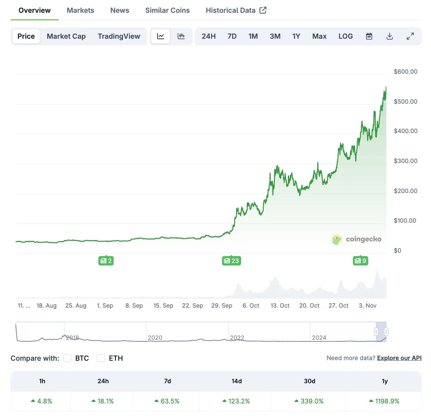 ZEC 无疑是本轮行情的绝对龙头。从 10 月 23 日的 237.84 美元起步,到 11 月 7 日触及 532.06 美元,40 天内涨幅达到 120%,年内累计涨幅更是高达 700%。这一价格不仅创下 2018 年以来的新高,更让 ZEC 重新进入主流投资者的视野。
