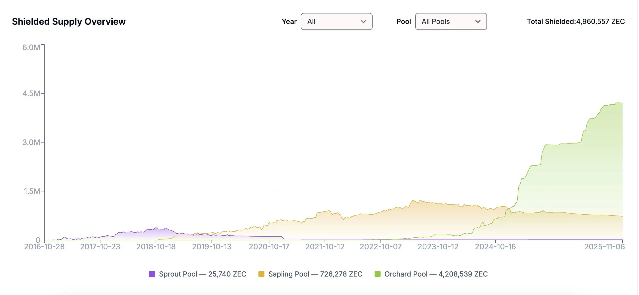 ZEC 屏蔽池余额在 40 天内从 400 万枚增长至 490 万枚,增幅达 25%;屏蔽交易占比从不足 10% 跃升至 25-30%,这意味着越来越多用户选择完全匿名的交易方式。而用户越多,隐私保证越强,网络效应也就越明显。