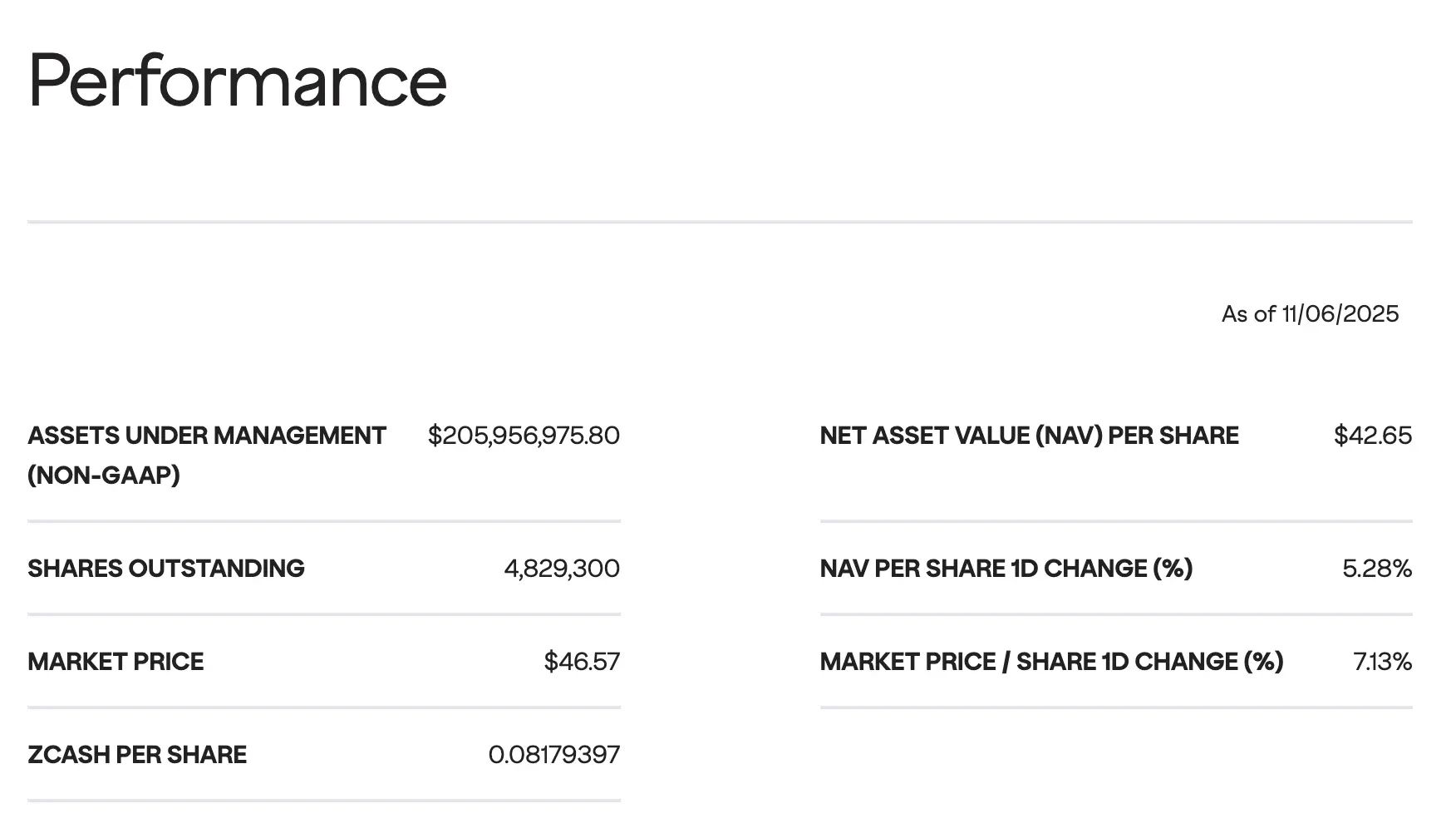 数据显示,ZCSH 的 AUM(管理资产规模)在一个月内暴增 228%,从约 4,200 万美元增至 1.36 亿美元,占 ZEC 流通量的约 1.9%。对于一个日均成交量数亿美元的资产而言,近 2% 的筹 码被长期锁定在信托中,供给端的紧缩效应显著。