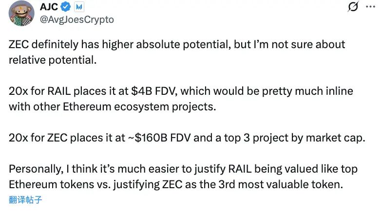 从估值角度看,两者的上涨空间存在巨大差异。如果 RAIL 上涨 20 倍,其完全稀释估值(FDV)将达到 40 亿美元,这与其他以太坊生态的顶级项目估值基本一致,市场容易理解和接受。但如果 ZEC 上涨 20 倍,其 FDV 将达到 1600 亿美元,成为市值第三大的加密资产,仅次于比特币和以太坊。这需要市场相信 ZEC 真的能与比特币、以太坊平起平坐——这是一个极高的门槛。