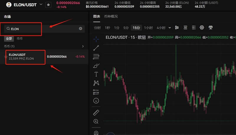 11、在搜索框输入ELON,选择ELON/USDT交易对,可以看到ELON实时行情