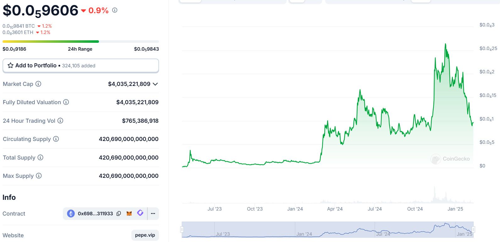 自那以后,$PEPE 的价格走势如同过山车一般,经历了多次剧烈的波动。然而,自 2024 年 12 月达到历史最高点以来,$PEPE 的价格一直在大幅下跌。
