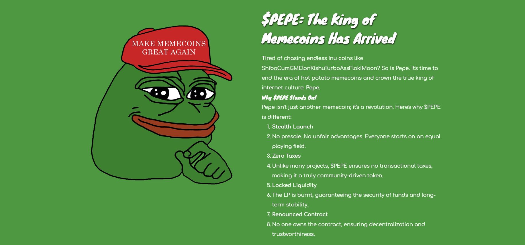 Pepe 的最大供应量为420,690,000,000,000 个代币。除了分配方案外,最初的概念还包括通缩机制——即每笔交易都会销毁一小部分代币,从而造成短缺。