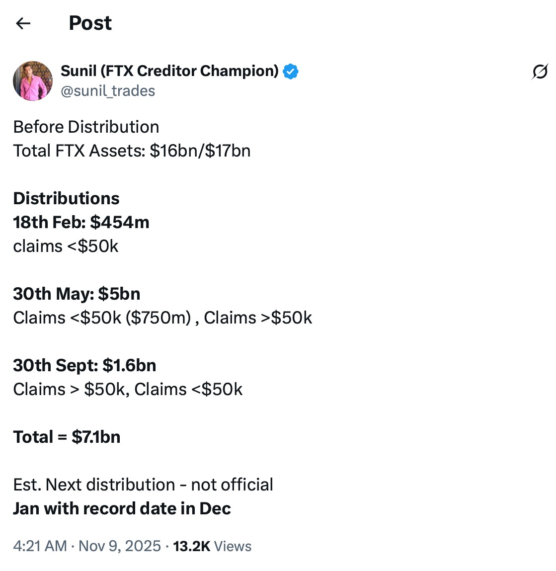 5月30日进行了更大规模的50亿美元支付,而最新一轮于9月30日进行,向债权人分配了另外16亿美元。下一次分配预计在2026年1月进行,尽管尚未得到FTX遗产管理方的确认。