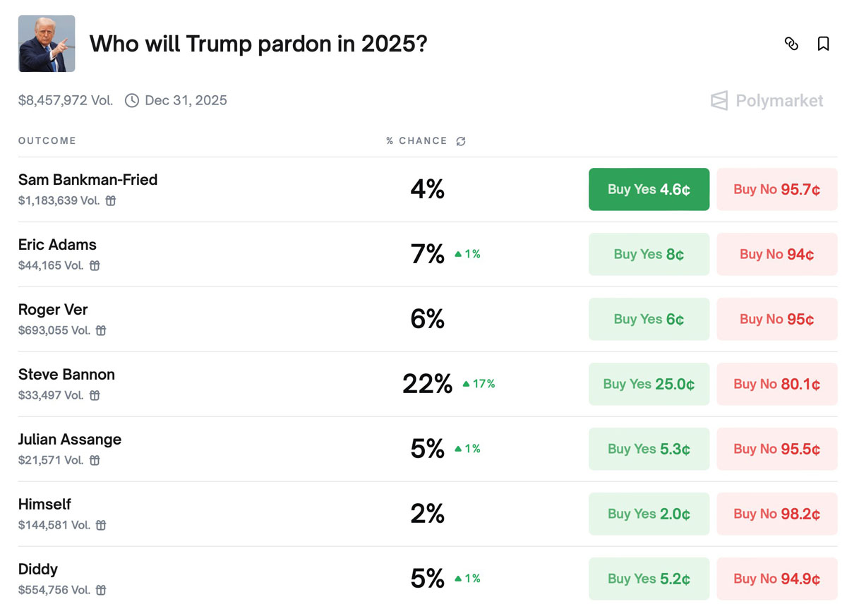预测市场Polymarket目前认为Bankman-Fried在2025年获得总统赦免的可能性仅为4%。前Alameda Research首席执行官Caroline Ellison与检察官合作,于2024年底开始服刑,预计将于2026年年中获释。
