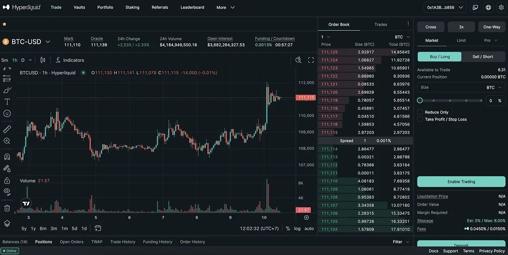 费用从 0.015% 的做市商和 0.045% 的承销商开始,根据交易量进一步降低,交易量大的做市商还可获得回扣。Hyperliquid 支持 200 多种永久合约,杠杆率高达 50 倍。交易者通过 MetaMask 或 Coinbase Wallet 等 Web3 钱包直接入金,保持完全的资产托管。