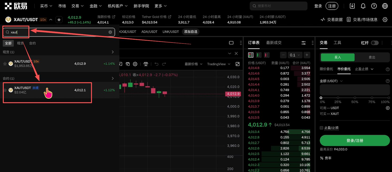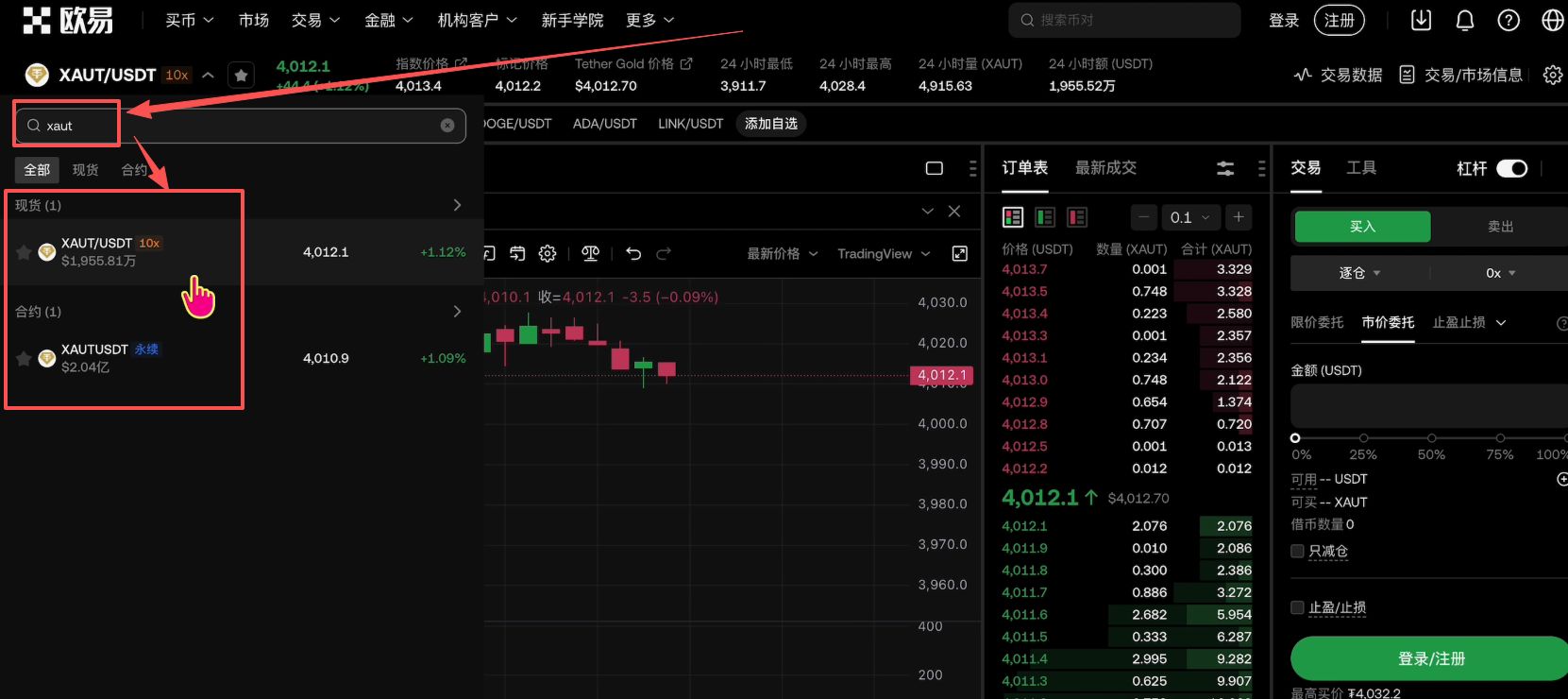在这里你可以搜索“XAUT”代币,我们选择“XAUT/USDT”,就是我们使用USDT去兑换XAUT代币。