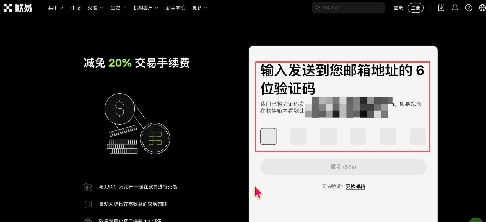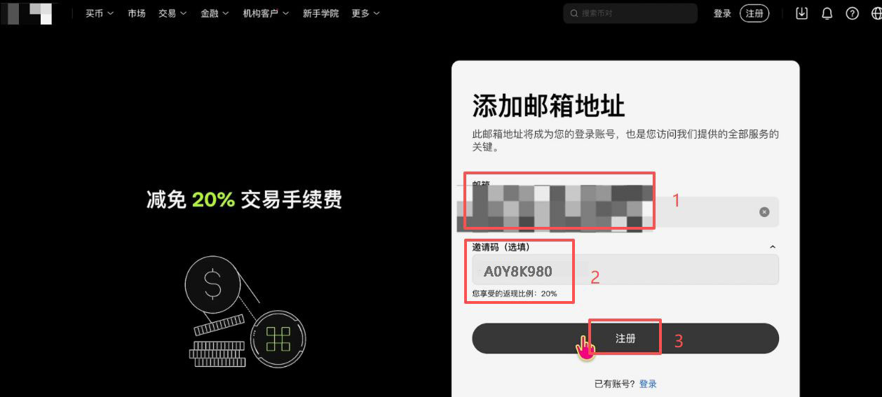 输入一下邮箱,大家可以使用Outlo币安邮箱、163邮箱或者是Gmail邮箱来进行注册。下方这里有一个邀请码的选填,如果您是通过我的链接进来的,这里会自动为您填写好,告诉您享受了20%的返现比例。如果没有填写,你就可以填写jbzj999,同样会获得20%的返现比例。点击【注册】。