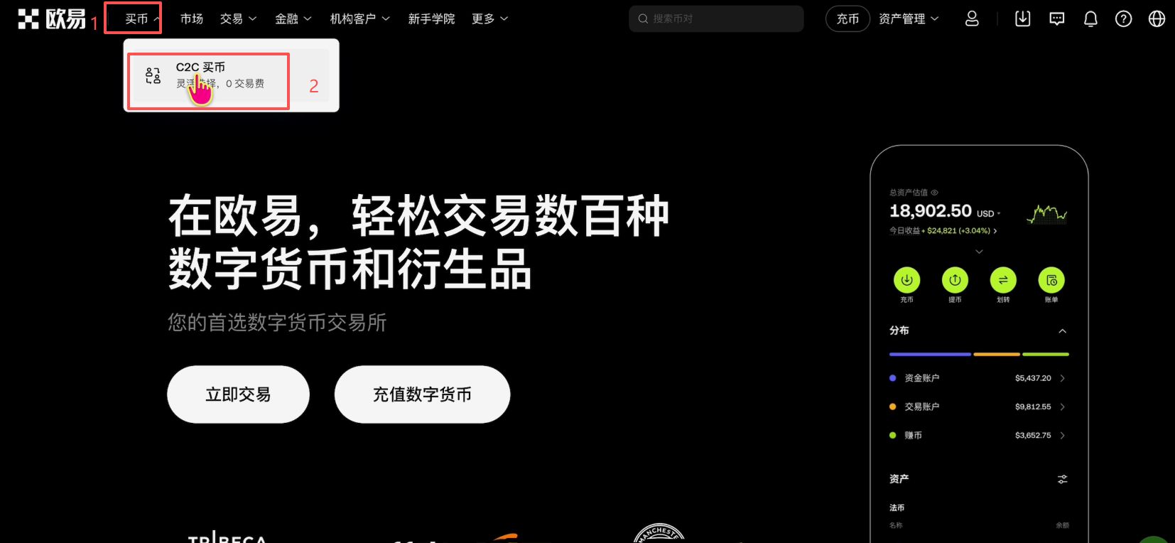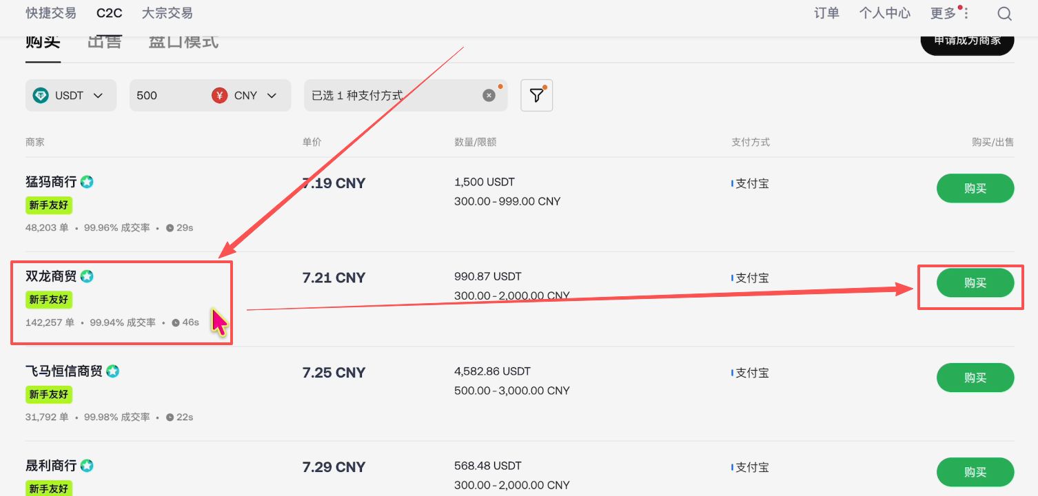 上方有快捷交易、C2C交易还有大宗交易。我们一般都是使用C2C交易,就是个人对个人交易。