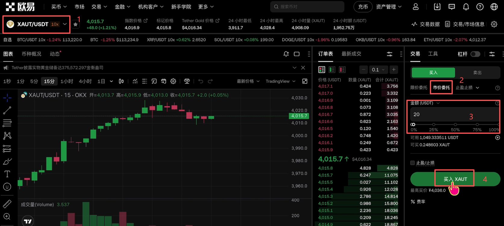 比如说这里我想使用限价委托,它现在的价格是4015,我想要在4000的时候来进行购买。设置好之后,在设置一下要购买的数量,然后点击买入做多或者是卖出做空。如果你想要做空XAUT就点击【卖出做空】。